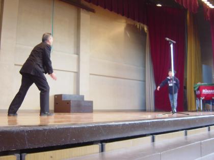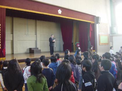 今日の全校朝会では、先日行われた竹とんぼ教室の様子が校長先生から、お話しされました。竹とんぼを飛ばすには、手先、指先を器用に使わなければならず、竹とんぼ教室で上手に飛ばすことができた児童が、朝会実演してくれました。とても上手に飛ばすことが出来ました。