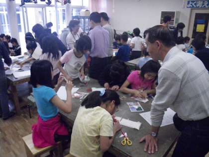 土曜講座「このゆびとまれ」も今年で20周年を迎えます。今日は土曜日の午後2時半からでしたが多数の子どもたちが集まってくれました。山口さん、古市さんという元PTA会長・役員の方をはじめ現役PTAの方々、そして京西の教員と多数のお手伝いの人が参加してくれています。