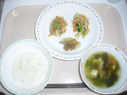 今日の献立は、ごはん、牛乳、ホキのヤンニョンジャンかけ、ナムル、チャプチエ、わかめスープです。ヤンニョンジャンは薬念醤と漢字で書きます。韓国の香辛料や薬味や調味料を組み合わせて作ります。