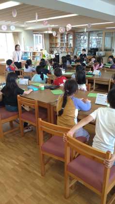 2年生が図書室で、図書のオリエンテーションをしていました。ルールを確認しています。