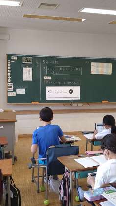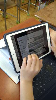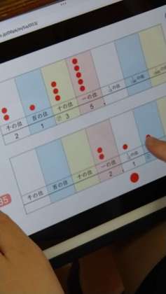 教科書の2次元コードを読み取り、位取り表のページへ。「2135」と「2.135」を赤い点を動かして位取り表に表します。実際に動かせるので、分かりやすいです。更にそれをスクリーンショットで撮り、ロイロノートの提出箱に上げました。ずらりと皆の上げた画像が並び、皆の意見をぱっと共有できます。