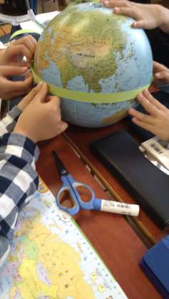 緯度と経度、緯線と経線について知り、地球儀上にそれぞれの線を90度で交わらせた紙テープで表していました。縦と横、どちらが緯線でどちらが経線か・・・分からなくなりやすいので注意です。