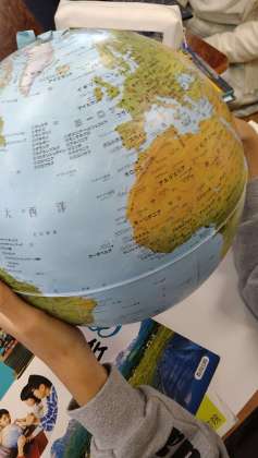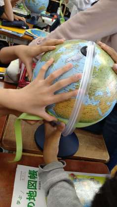 5年生は、社会科で「地図」について学んでいました。今日は地球儀の地図の表し方を学習しているようです。