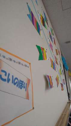 廊下の掲示板には、先日制作していた色とりどりのこいのぼりが気持ちよさそうに泳いでいます。