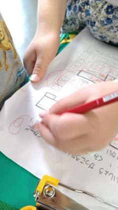 今日は準備を進めてきた学校たんけんのです。グループに分かれて2年生が1年生をエスコートして学校の中を案内します。