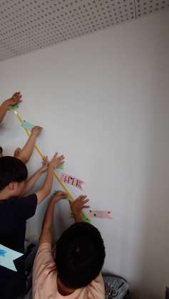 4年生の教室で、健診の順番を待っている間に、かわいいこいのぼりを作っていました。できたこいのぼりは、竿に見立てて掲示板に貼った紙テープに沿ってつけています。