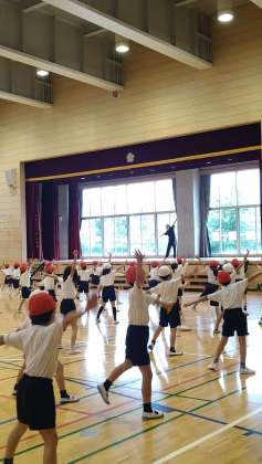 運動会練習が始まりました。体育館に学年で集まっています。(外は雨ですが、元々、表現の練習は、全体への説明をしやすいので、初め体育館で始めることが多いです。)