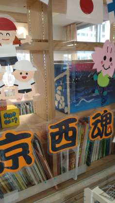 さて、最後の飾りは、5月に入って新しくなった図書室の飾りです。運動会の飾りが、運動会ムードを盛り上げてくれます。「京西魂」見せましょう!