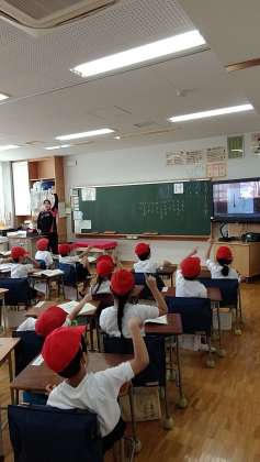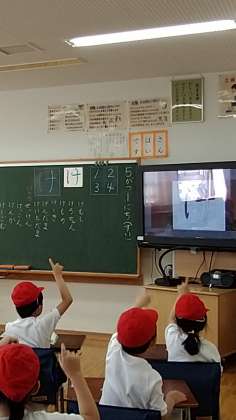 別の学級では、音楽の時間。みんなで集まって、画面を見ながら歌っていました。こんな風に、机から離れて集まったりする動きができるのも、1か月経った1年生の成長です。