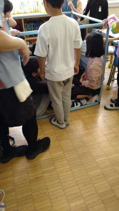 先日5年生が、一辺が1cmの立方体(1立法センチメートル)を使って、それが何個入るかで体積を求めているのをご紹介しましたが、この日登場したのは、巨大な立方体。一辺が1mの立方体(1立法メートル)です。何人入れるのかチャレンジ中でした。人間だと、上が空いてしまったりして、ぎゅうぎゅうに詰めるのが難しいです。