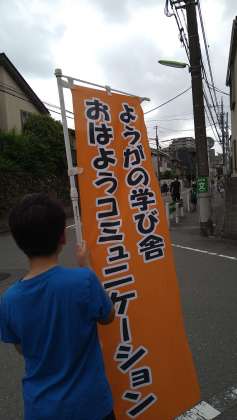 用賀の町に、朝から元気のよい挨拶が飛び交います。今日と明日は「おはようコミュニケーションデー」です。のぼりを持った代表委員会の児童が通学路に立ち、登校してくる児童や町の人たちに挨拶をしています。