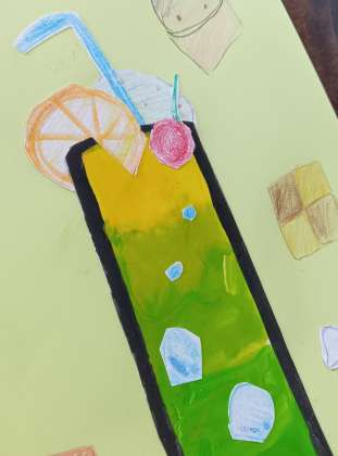 それにしてもすてきな作品です。グラスに入った飲み物ですが、背景とは別に作ってから貼られているので、浮き上がったように見え、すぐそこにあるようです。グラデーションになっているものや様々な色を使ったものがあり、色使いもきれいです。