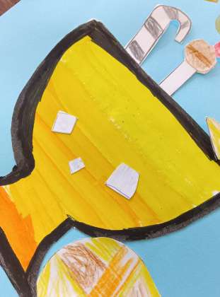 3年生が完成した図工の作品を机に乗せていました。作品は、写真に撮って先生に提出したようです。