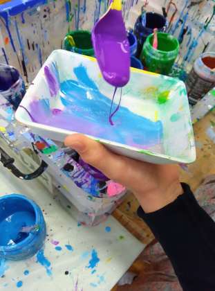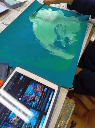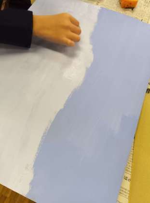 シンプルですが、色のセンスが問われる難しい課題だなあと思いましたが、さすが6年生、自分の描くものを決め、それに合う色を選んでいました。まず塗って、別の色を足し、また塗る。美しい色のハーモニーが生まれていました。