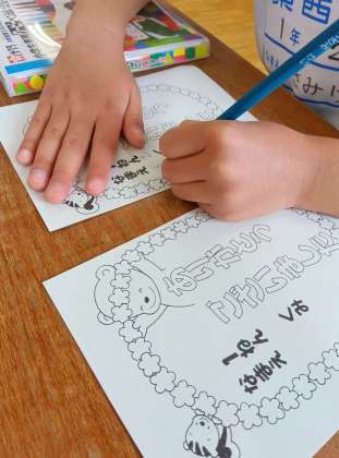 1年生が、お礼のお手紙を書いていました。まだ長い文章は書けないので、「ありがとうございました」の文字や周りの絵をきれいに塗ったり、飾ったりして仕上げていました。