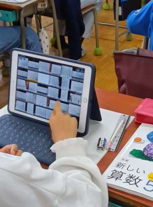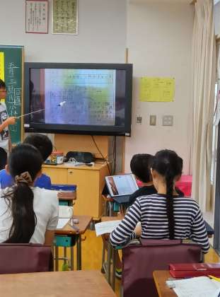 画面に映した自分の考えについての説明をしています。「この式はどういう意味かな。」という質問が出て、その質問に別の児童が答えていました。1つの考えについて、発表者だけではなく、みんなで考え、理解を深めます。