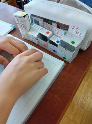 ごみの分別・・・エコな取組を見つけたので紹介しておきます(右写真)。先日の立体の体積の学習を生かして作ったそうです。