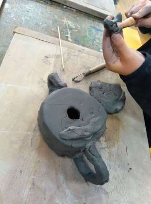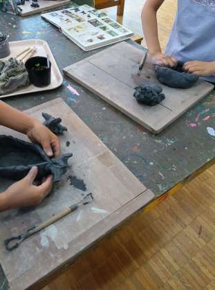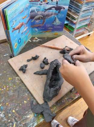 4年生の図工、粘土で植木鉢を作るようです。この日は、かたまりの形を作ってから、「かきべら」で粘土をかき出し、イメージした形にしていきます。植木鉢なので、底には水が抜ける穴もあります。形ができたら、焼いて完成のようです。