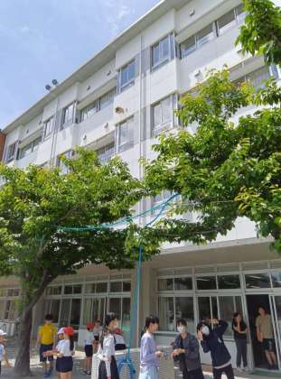 よい天気です。元気に校庭で遊んでいます。太陽がSUNSUNと照っています。