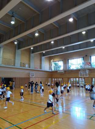 今日の中休み、体育館は1年生が遊んでいます。おや?あちこちに大きな子たちが混ざっているな、と思ったら、6年生が一緒に遊んでくれていました。