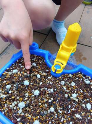 昨日、通りかかると、早くも芽が出たという子が植木鉢を見せてくれました。周りを見るまだほとんどの子は芽が出ていないようです。これからが楽しみですね。
