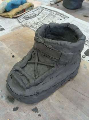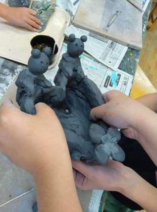 形ができて乾燥させ、焼き上がるまで、うまくできるかドキドキですね。完成した暁には、これに「バジル」を植えるそうです。図工室からも出られる2階の中庭に、それらしきものを発見しました。