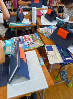 共有ファイルを使って、グループごとに調べたことをまとめていました。付箋(デジタル)に書いて、日本地図の周りに貼っていきます。共有ファイルは、みんなが同時に作業ができ、みんなで1つのものを作ることができて便利です。