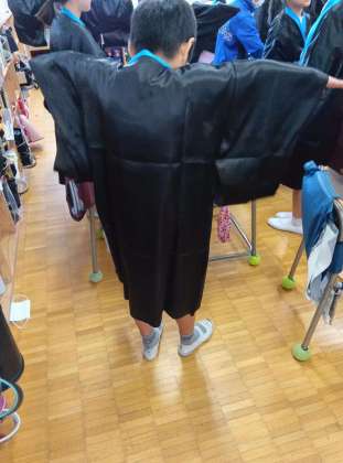 先週、衣装を受け取り、嬉しそうに袖を通していました。鉢巻を巻くのを手伝ったり(「前見えてますか!?」)、踊りを踊ってみて動きを確かめたり・・・とにかくうれしそうです。うれしいんですよね、新しいグッズを受け取るのって♪