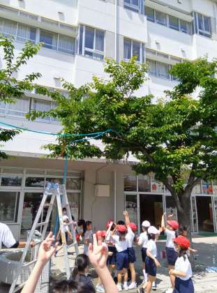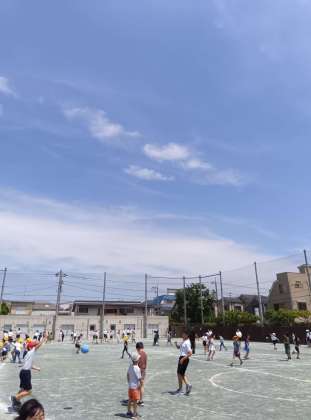 中休み、いいお天気の中、校庭を走り回る子供たち、元気です!