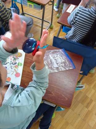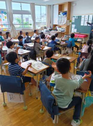 1年生が、また音符の学習をしていました。今回は、カスタネットをつかってリズムを打っています。