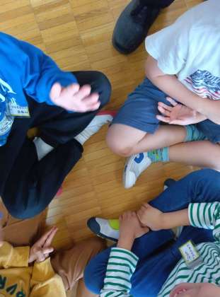 隣のクラスでは、自分の打ったリズムを隣の人が同じように真似していくゲームをしていました。リズムの良さを楽しんで、音楽の知識も覚えていってほしいと思います。