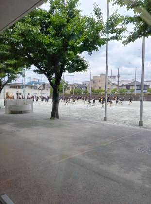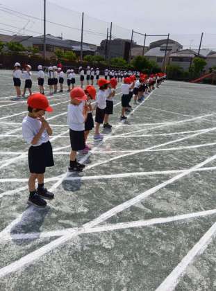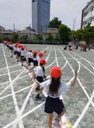 昨日の1年生の校庭練習、音楽に合わせて入場から退場までやってみます。細かい立ち位置の修正や踊りの向きの確認などもしていました。