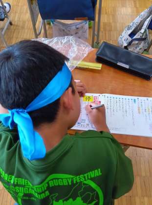 5年生、配られた法被に鉢巻がうれしすぎたのか、そのまま勉強中。