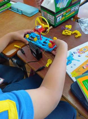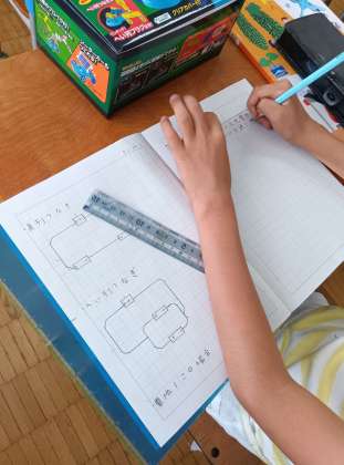 どこをつなぐと道が正しくつながるか、説明書を見ながら組み立て実験を行っていました。