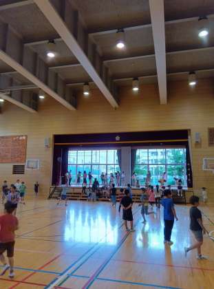 体育館の割り当ては4年生。鬼ごっこ、肋木(ろくぼく)、バスケットボール・・・舞台の上でフラフープをしている子もたくさんいます。