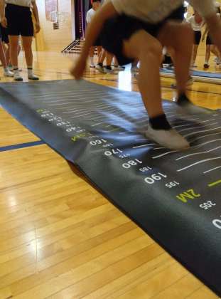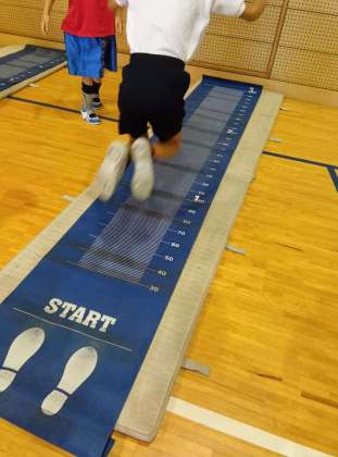 体力テストの種目は、「走り」ではなく「立ち」幅跳びです。足をそろえて立ち、1・2の3で跳びます。つま先から踵(かかと)までの距離を計測します。踵よりも後ろに手をついたりすると、そこまでが記録になりますので、倒れこむなら前へ。
