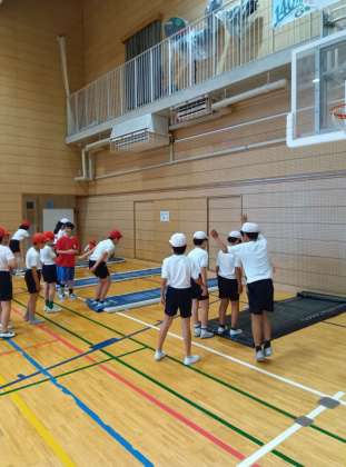 よく砂場で行いますが、京西小学校には、室内用の専用の計測グッズがありますので、体育館で実施できます。これはありがたい。