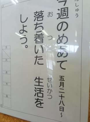 運送会明けということで、安全に過ごせるよう、「落ち着いた生活をしよう。」が目標でした。雨で外に出られない、という日もありますので、そういう日は注意が必要です。晴れた日にも、に出ていくのに走って出ていく児童が多くおり、看護当番からの注意の放送もありました。