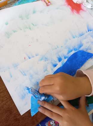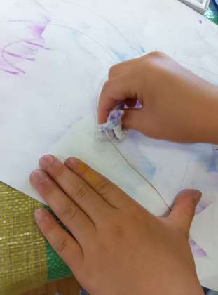 2年生は、先日練習していたクレヨンで描いた色をティッシュでぼかす技法を使って作品をつくっていました。