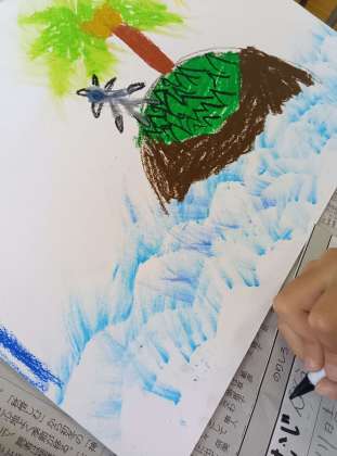 空を表現するのに使ったり、海の波を表現するのに使ったり、うまく技法の良さを生かして作品に仕上げていました。ぼんやりした色を表現したり、色が混じり合ったような部分を表現するのに適しています。表現の幅が広がります。