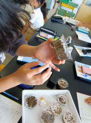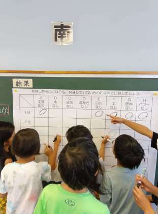 の条件を変えて植え、発芽するかどうかを調べていました。各班で、種子の様子を観察して、学級全体で集約します。結果が割れているところについては、話し合い、意見を出して納得して結果を確定させていきました。