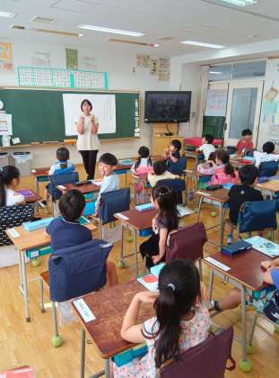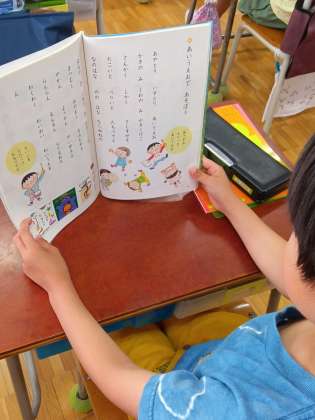 この日は、「あいうえおであそぼう」というリズムのよい詩のような文書についての学習です。たくさん声に出して読んだり、表現の秘密を見付けたりしていました。本を読むときには、しっかり教科書を持って読みます。左の写真は、私が勝手に「この日の理想的な教科書の持ち方大賞」MVPを授与した児童です。
