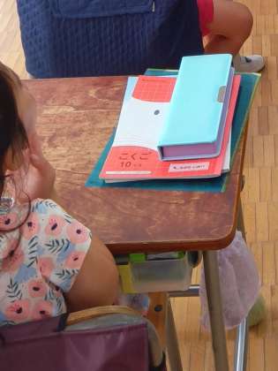 まず、机の上を整理して物を置くところから始まります。教科書・ノート・下敷き・筆箱をそろえて、「名札の反対側」に置きます。そして、始まりの挨拶をして授業を始めます。