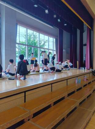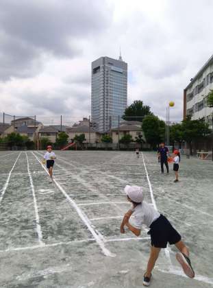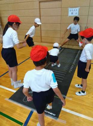 校庭ではソフトボール投げ、体育館では、立ち幅跳び・上体起こし・反復横跳びを行っています。まずは、5・6年生が自分たちの計測を終え、その後1年生は6年生と、2年生は5年生とペアになってグループを作って動いています。高学年の児童が、競技のサポートや記録を行って1・2年生を助けてくれています。