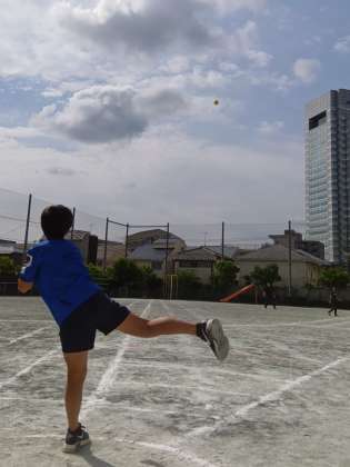 おはようございます。今朝は、朝の時間で昨日の体力テスト欠席者のソフトボール投げの記録測定を行っていました。ラインがまだ生きているうちに。投げ姿が美しいです。