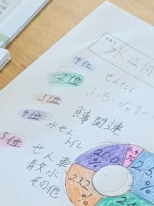 水はどこで生まれて水道まで届くのか、水源林の学習から始まり、浄水場で水をきれいにする仕組みまで様々な「水」に関するが学習を進めてきたところです。今回は、生活に使う水について調査をして、水を大切に使うにはどうすればいいかを考えていました。