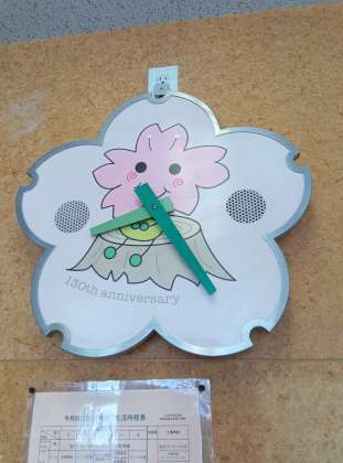 さくらちゃん時計、決められた時間に校歌が流れるのをご存知ですか。朝は8時25分になっています。その後は・・・学校公開にいらしたときにちょうど聞けたらラッキーです!