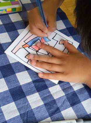 小さめのカードの中に枠を描きます。枠からスタートして、枠まで線を引きますが、一度止まって曲がったり、くるんと回転したりしながら、枠の線までたどり着きます。この線を何本か引くと、いろいろな模様が浮かび上がってきます。線を足したりして模様を完成させ、仕切られた中を色の濃さを変え、組み合わせを変えながら塗っていきました。
