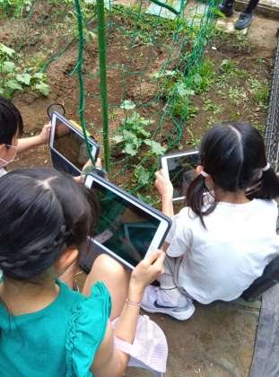 4年生の植えた「ツルレイシ」の観察です。ちょっと間隔が空いてしまったということで、今どんな風に生長しているか、予想を立ててから観察に向かいました。
