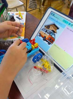 4年生が、「電気のはたらき」の学習の実験をあらかた終え、車づくりをしていました。